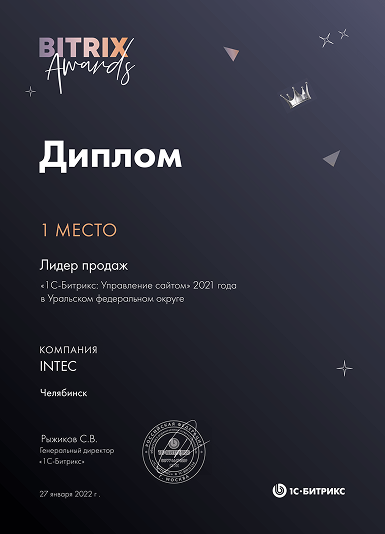 1 место Лидер продаж «1С-Битрикс: Управление сайтом» 2021 года в Уральском федеральном округе